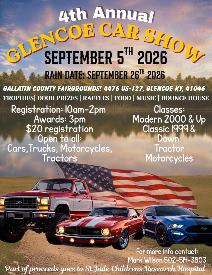 Gallatin County Fairgrounds Glencoe, KY 4476 US Hwy 127, Glencoe, KYRev those engines, Gallatin County! The 4th Annual Glencoe Car Show is back, and we’re on a mission to top last year’s incredible $4,000 donation to St. Jude Children’s Research Hospital. Whether your project is show-ready or still a "work in progress," bring it out...